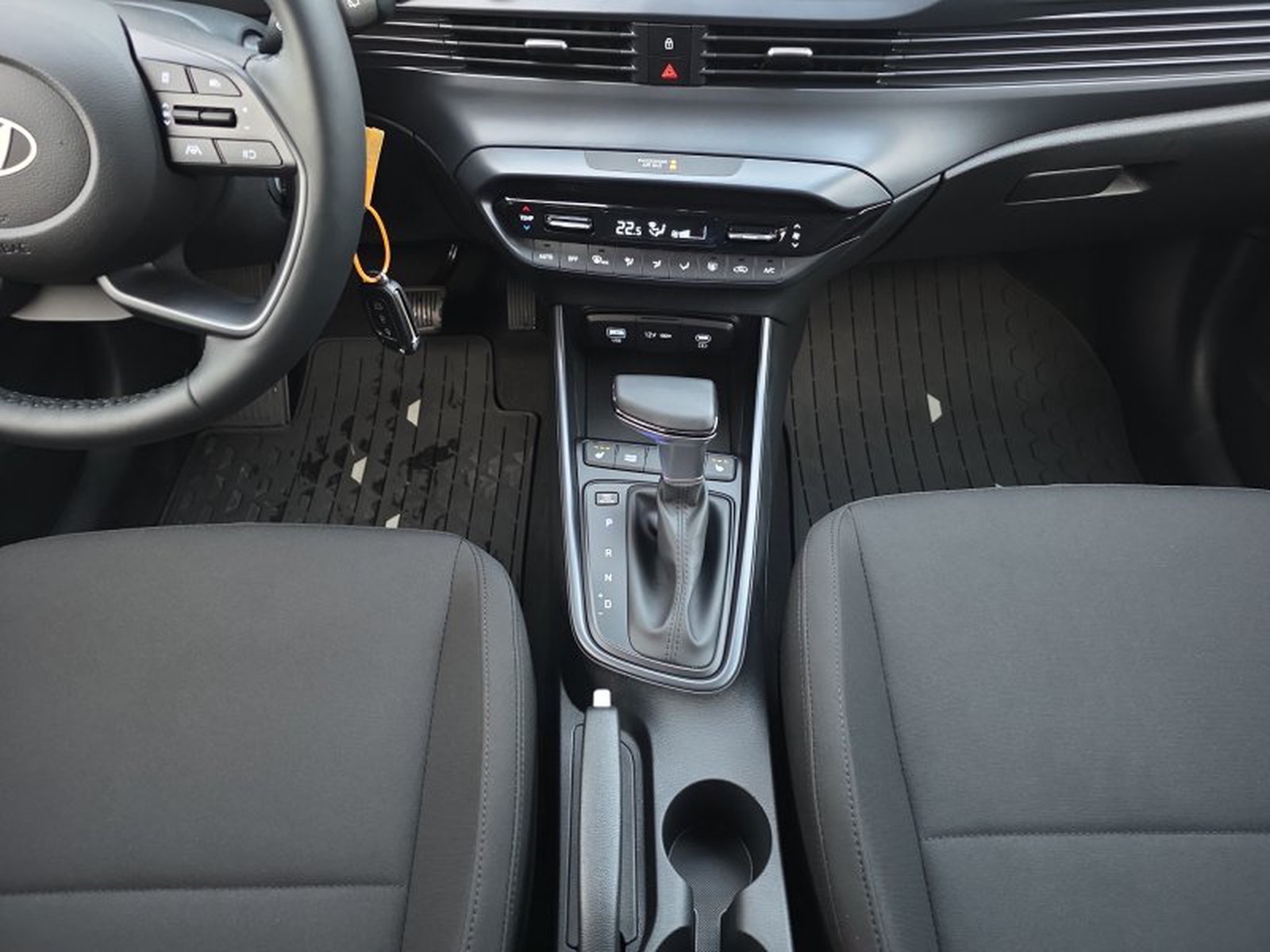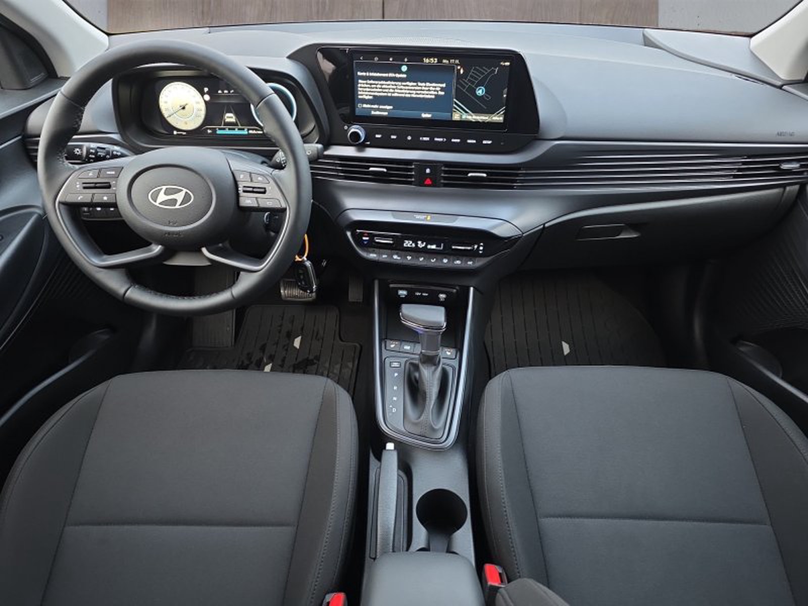 Die elegante Metallic-Lackierung in Schwarz zusammen mit den sportlichen 16-Zoll-Leichtmetallfelgen verleiht dem Hyundai i20 einen dynamischen Auftritt. Innen überzeugt das Fahrzeug mit einer hochwertigen Stoffpolsterung kombiniert mit praktischen Features wie einer Mittelarmlehne vorne und Isofix-Kindersitzbefestigungen hinten.