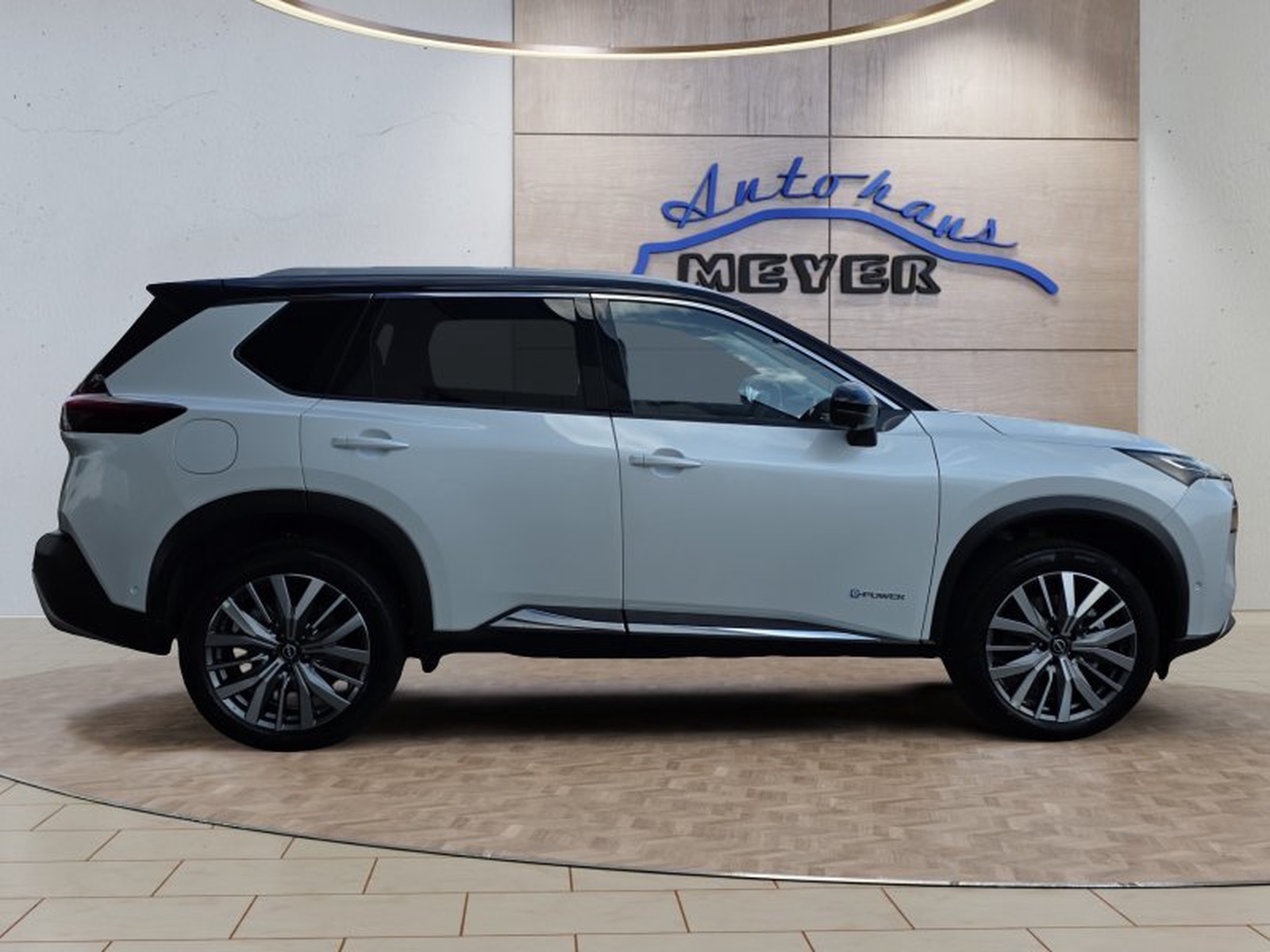 Der Nissan X-Trail Tekna+ besticht durch seine Zwei-Farbenlackierung in Pearl White mit kontrastierendem Schwarz, die ihm einen dynamischen und exklusiven Look verleiht. Das elektrische Panorama-Glasschiebedach sorgt für ein großzügiges Raumgefühl und lässt viel Tageslicht in den Innenraum strömen. Die 20 Zoll Leichtmetallfelgen unterstreichen den sportlichen Charakter des Fahrzeugs.