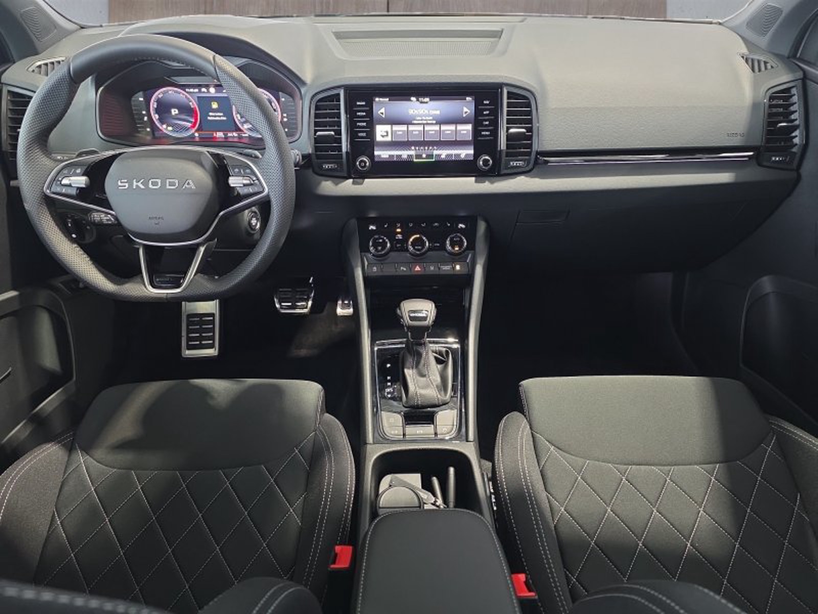 Das Interieur des Skoda Karoq Sportline bietet neben sportlichen Dekoreinlagen schwarze Akzente, ein beheizbares Multifunktionslederlenkrad mit Schaltwippen sowie eine 3-Zonen Klimaautomatik für individuellen Komfort aller Passagiere. Das Virtual Cockpit liefert alle wichtigen Informationen digital und übersichtlich auf einem hochauflösenden Display. Navigationssystem und Rückfahrkamera erleichtern jede Fahrt zusätzlich.