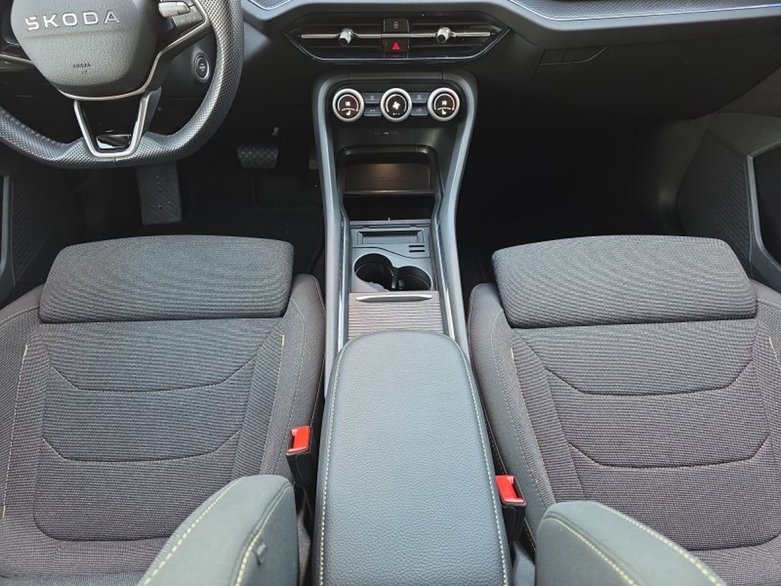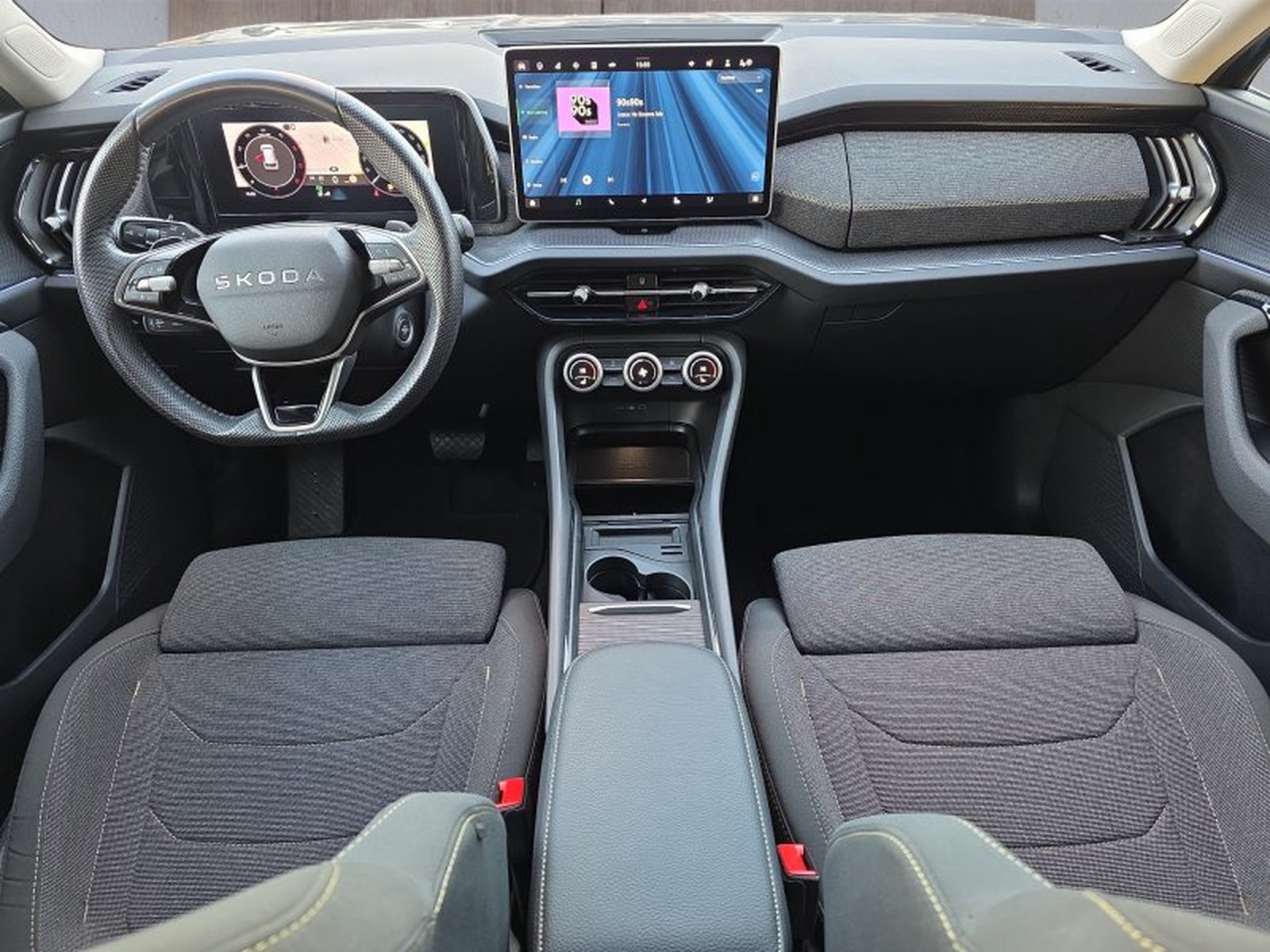Das Interieur des Skoda Kodiaq überzeugt durch hochwertige Materialien und durchdachtes Design. Der großzügige Innenraum bietet drei Zonen-Klimaautomatik, einen digitalen Kombiinstrumenten-Display (Virtual Cockpit Plus) sowie ein modernes Infotainment-System mit 13-Zoll-Touchscreen inklusive Navigation, DAB-Radio und Smartphone-Integration via Apple CarPlay und Android Auto. Eine induktive Ladestation ermöglicht kabelloses Laden kompatibler Smartphones.